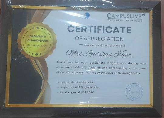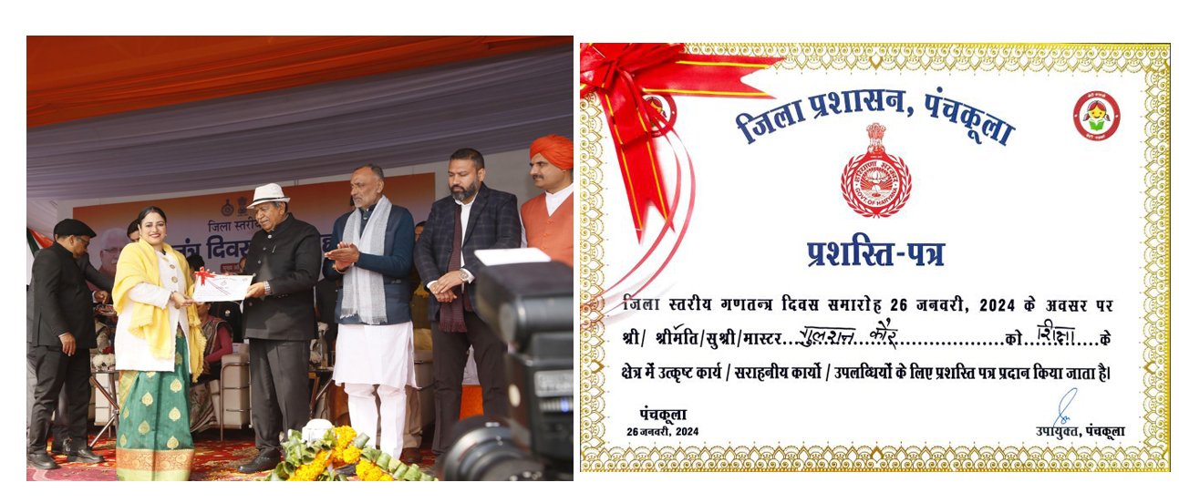 Ms Gulshan Kaur felicitated by Haryana Govt. for her exemplary contribution in the field of Education.