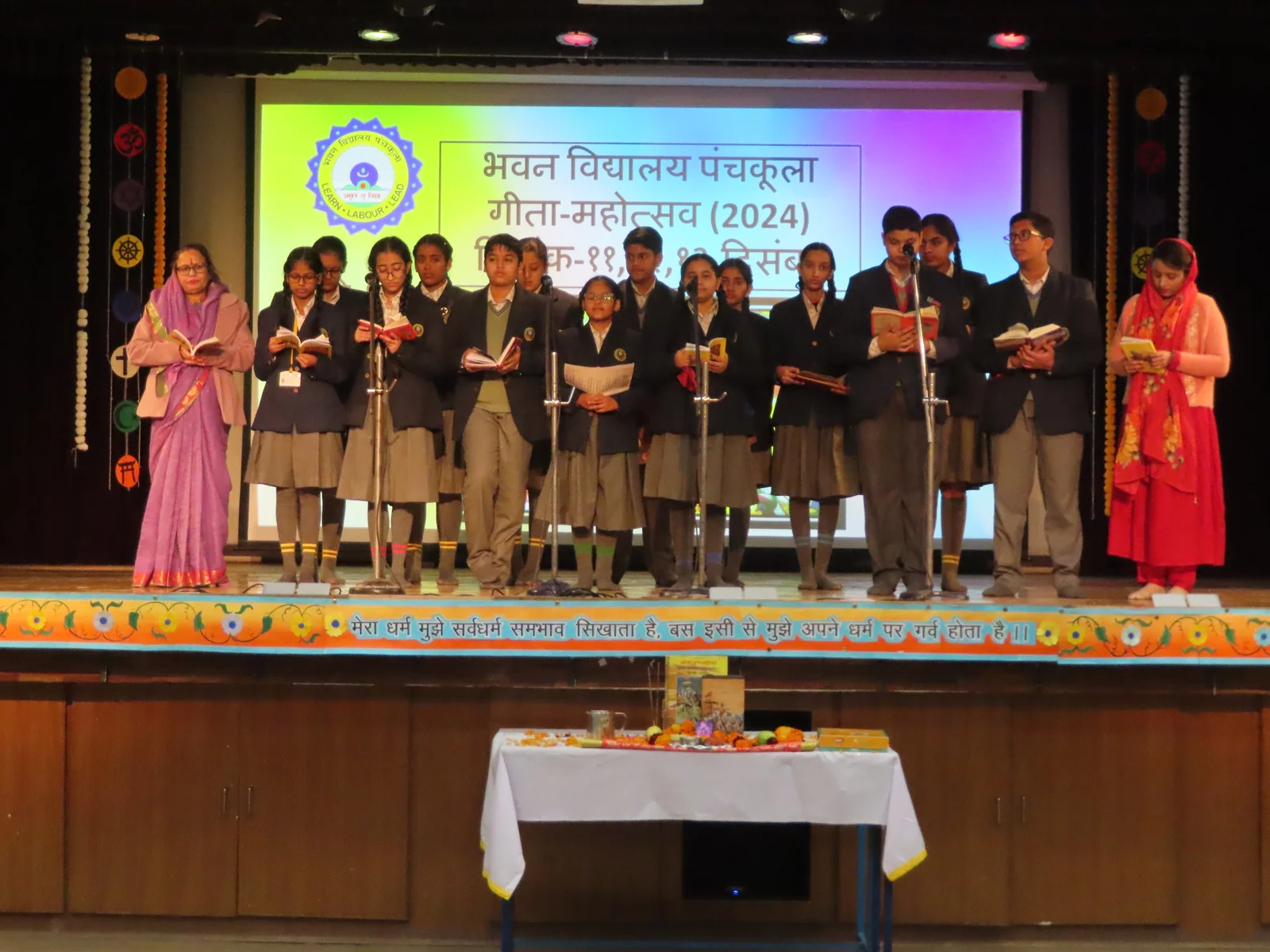 भवन विद्यालय, पंचकूला में त्रिदिवसीय (11, 12, 13 दिसंबर 2024) गीता जयंती महोत्सव बड़े धूमधाम से मनाया गया। समारोह की शुरुआत गीता जयंती महोत्सव के महत्व और इसकी प्रासंगिकता को समझाने से हुई। सबसे पहले छात्रों ने गीता के श्लोकों का सस्वर गायन किया, जिसके बाद संस्कृत के अध्यापक श्री श्याम चंद्र मिश्रा ने गीता के 18 अध्यायों का सार विस्तारपूर्वक प्रस्तुत किया।