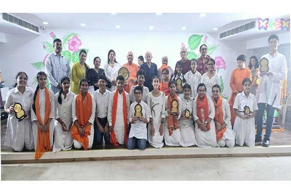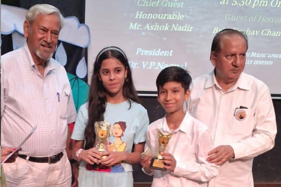Bhavan Vidyalaya Shines at Murchhana Cultural Society's Event Under the expert guidance of Ms. Jagriti Sood, young Bhavanites Riyaan (Class 4D) and Radhya (Class 7E) showcased their exceptional singing talent in a Bollywood-themed monsoon song singing event organized by Murchhana Cultural Society. Their remarkable performances earned them well-deserved trophies and a cash prize of Rs. 500 each