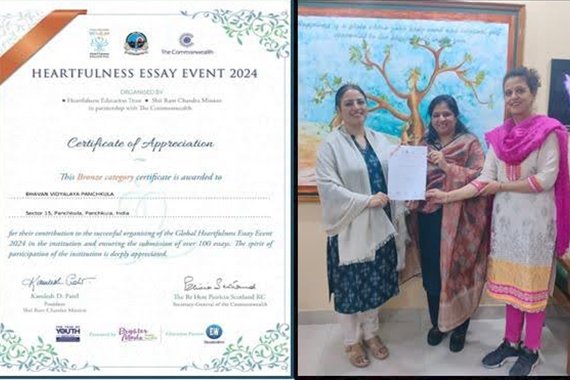 Under the inspiring leadership of our esteemed Principal ma'am, Bhavan Vidyalaya has been honoured with the Bronze Category Award Certificate for successfully organizing the Global Heartfulness Essay Event 2024 and submitting over 100 essays!