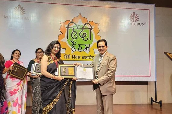 On the occasion of Hindi day on 14th September 2024, Dr Mukta Bhatia was honoured by Madhuban Educational Books in Delhi for efforts and contribution in making Hindi teaching more distinctive, progressive and creative.